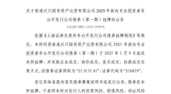 1月8日,上交所发布关于南通兴川国有资产运营有限公司2025年面向专业投资者非公开发行公司债券(第一期)挂牌的公告。